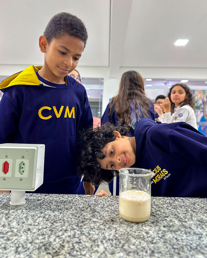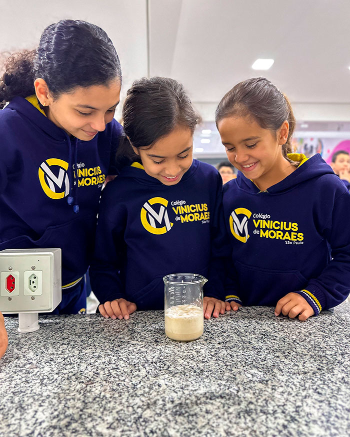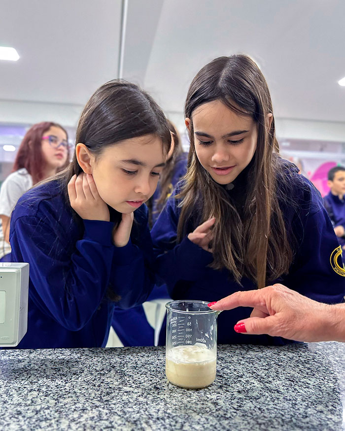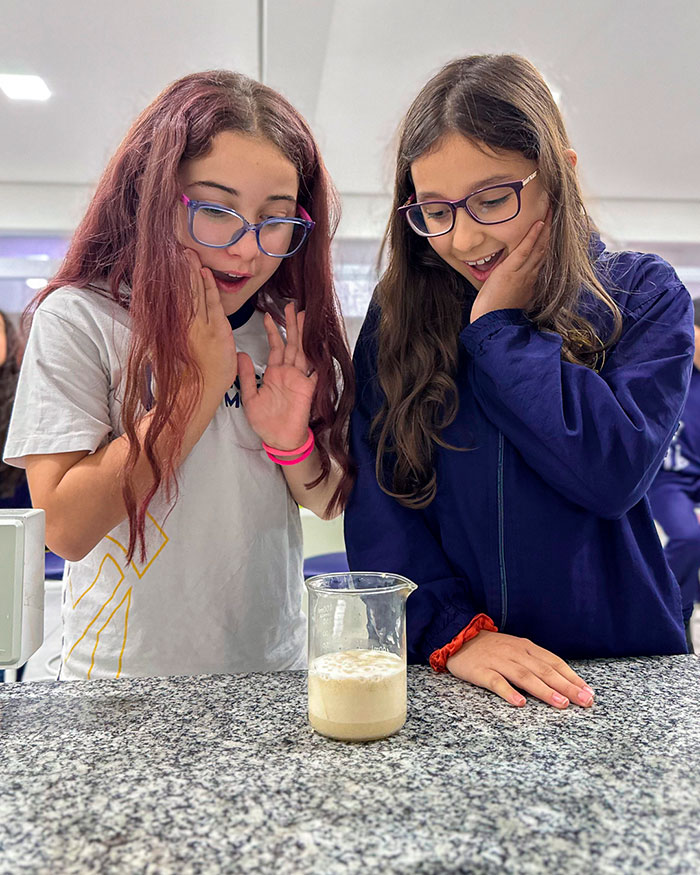 Depois de alguns minutinhos, observaram a formação de bolhas e o crescimento da mistura. 🤯 Isso acontece porque o fermento se alimenta do açúcar e libera gás carbônico, que é o responsável por fazer as massas crescerem!